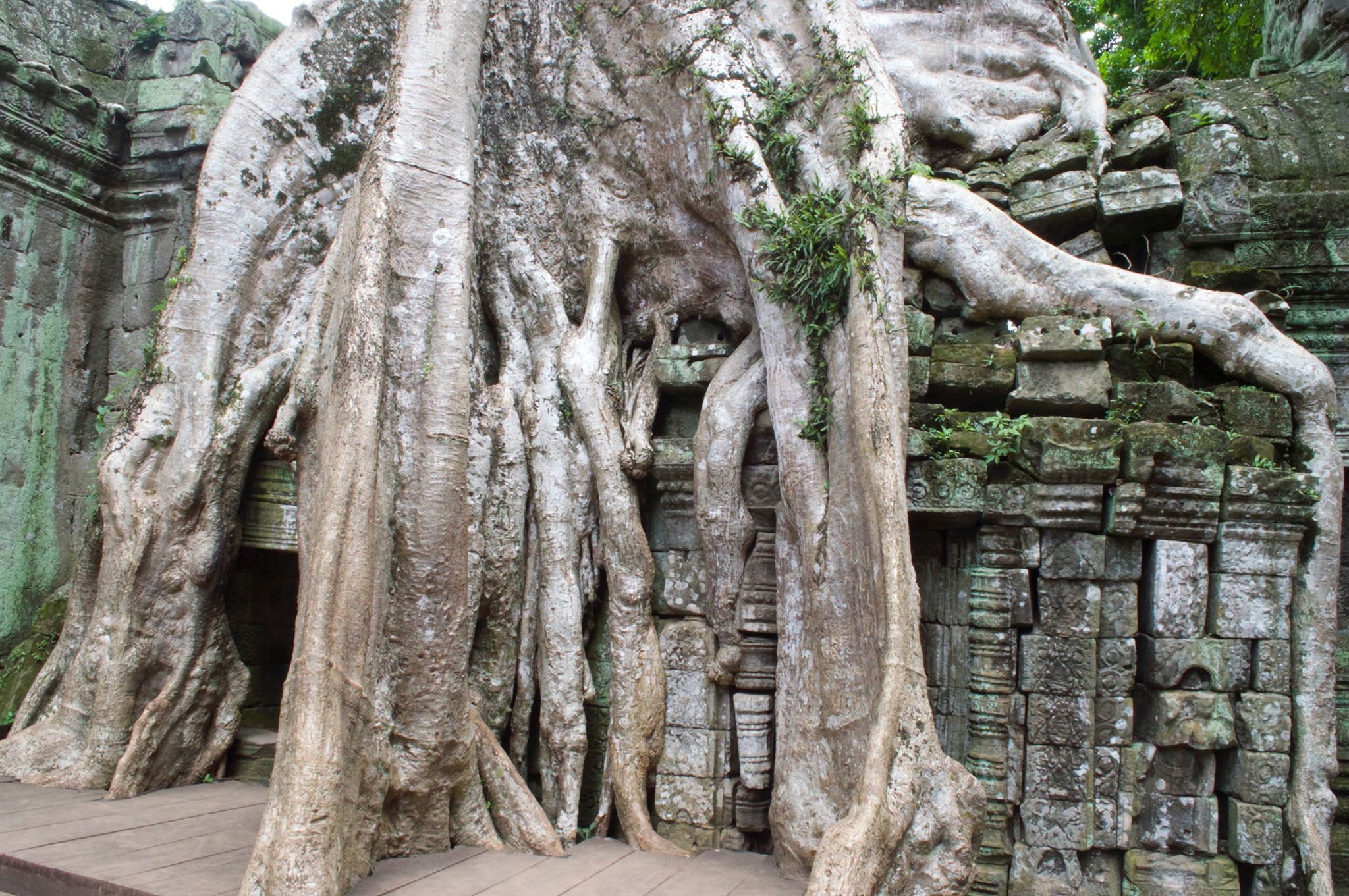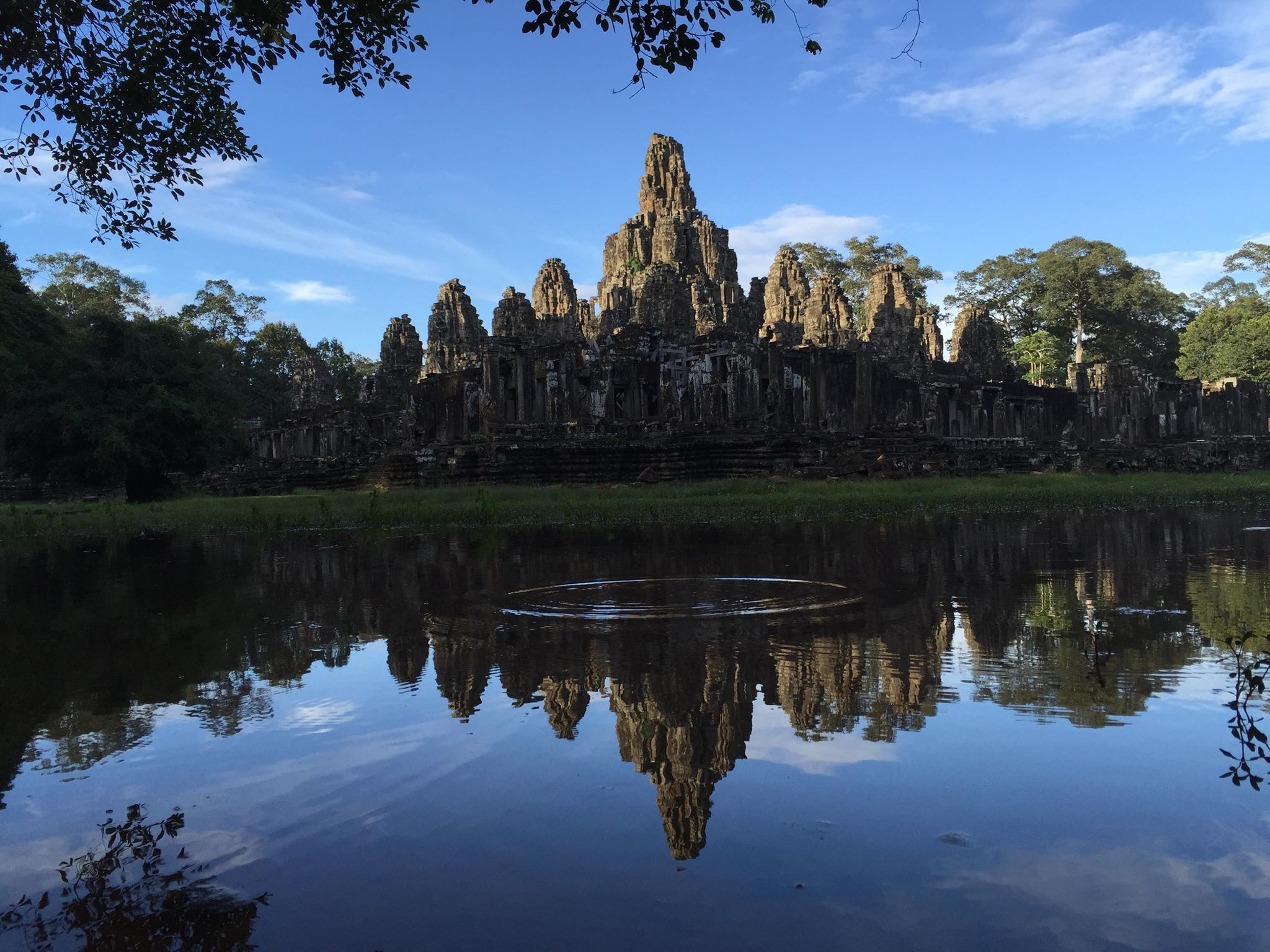 アンコール三聖山のひとつプノンバケン山は高さ約60mの丘陵の上に立つピラミッド型寺院です。急な参道を上ると中央祠堂があり、そこからは360°アンコール地域一帯のパノラマを見ることができます。日が沈む頃には、眼下の森や周囲の遺跡が少しづつ色を変えグラデーションとなりとてもきれいです。